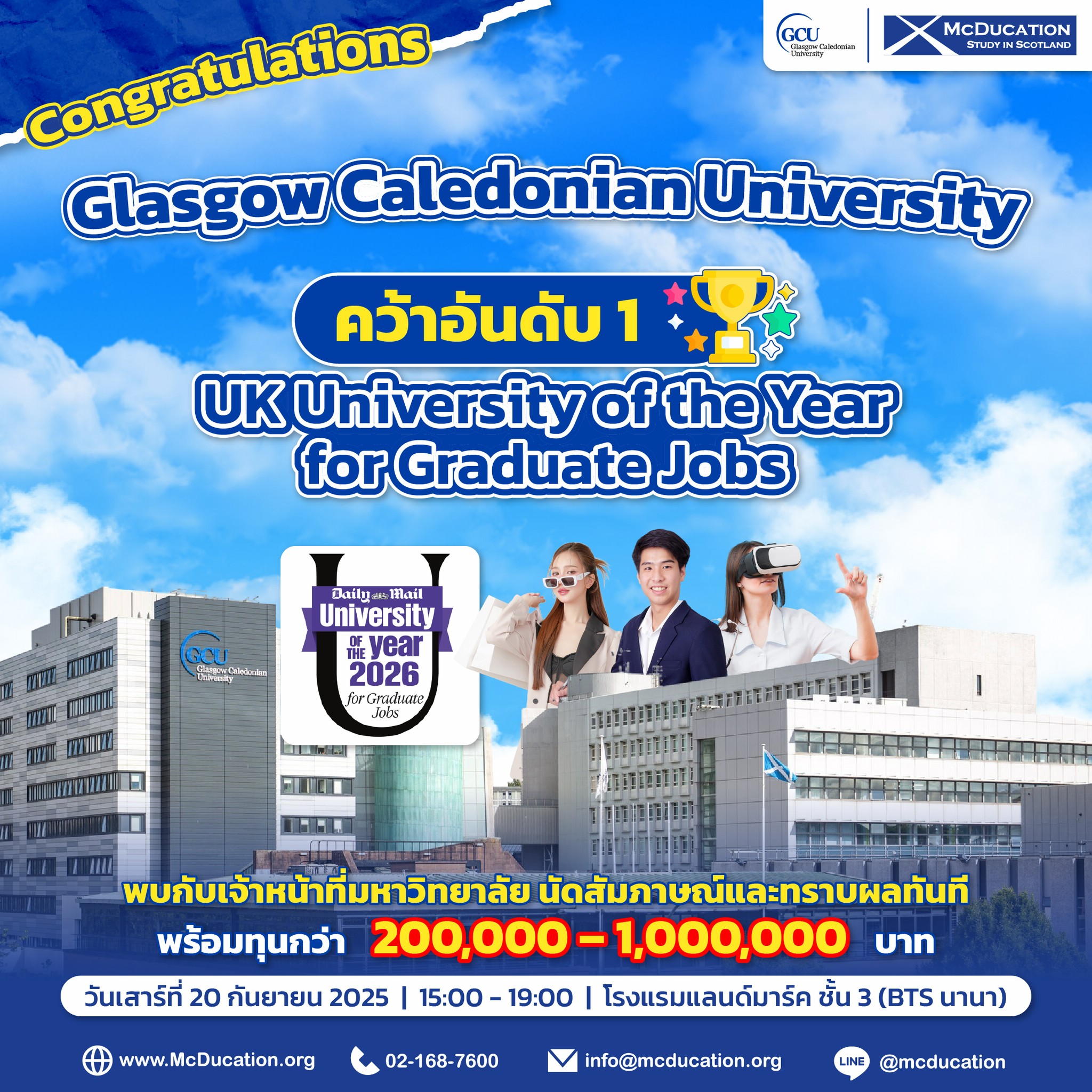 Glasgow Caledonian University คว้ารางวัลอันดับ 1 "UK University of the year for Graduate Jobs"